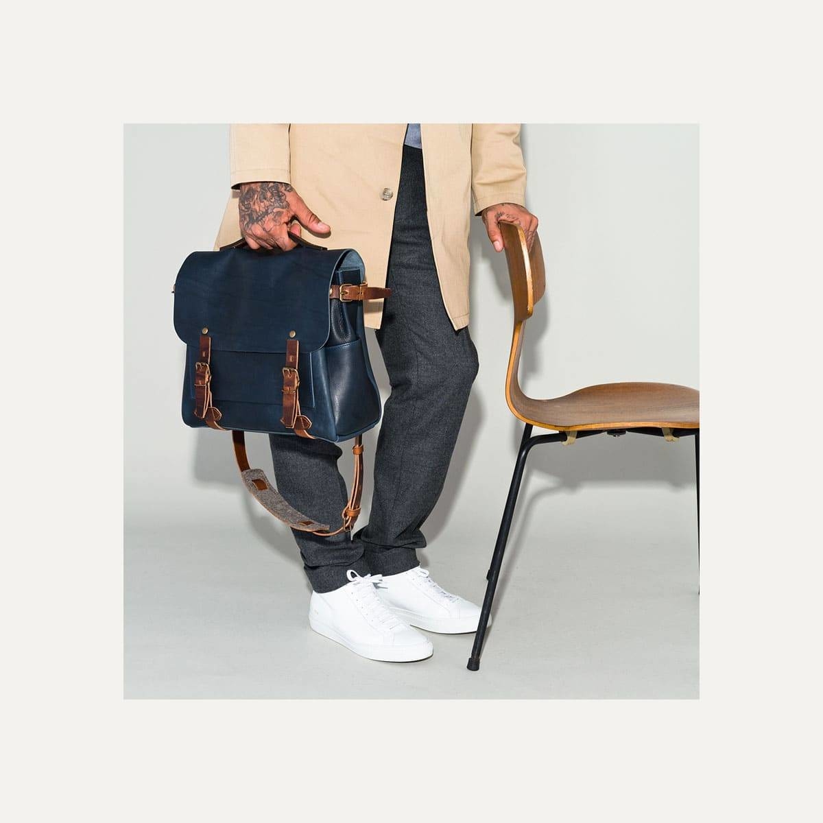 可拆卸及調整的皮革揹帶滿足手提、單肩揹及側肩揹等不同使用時地的需求,並且考量肩揹時的舒適性,在肩揹處的支撐皮墊內側縫合了一層毛氈軟墊以減少皮革與身體的摩擦,加強使用上的舒適性。