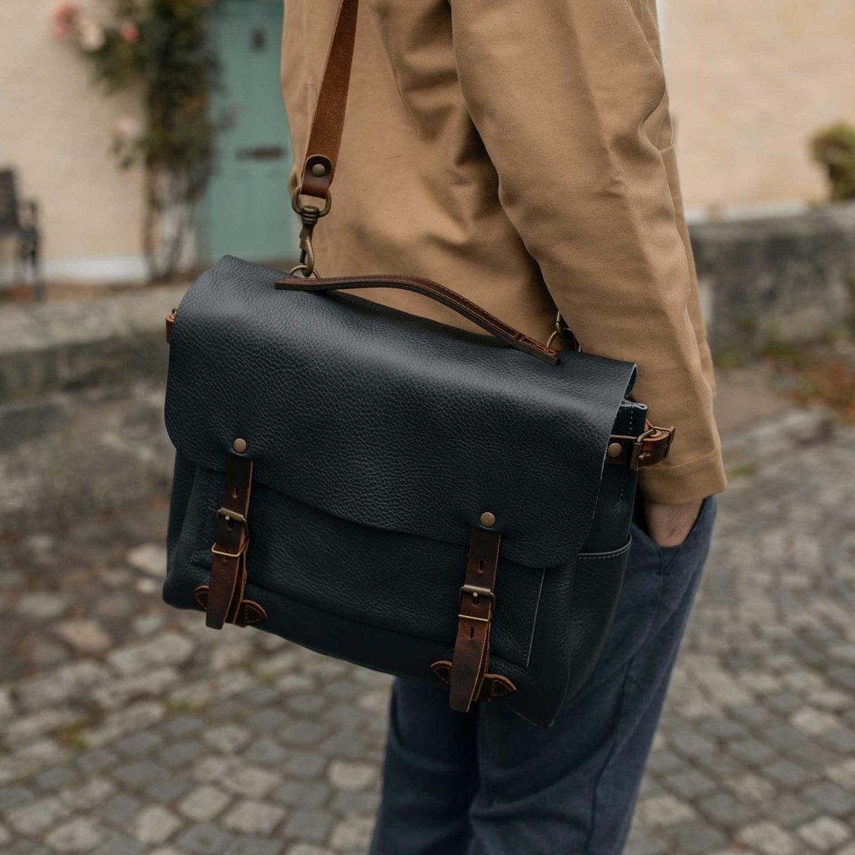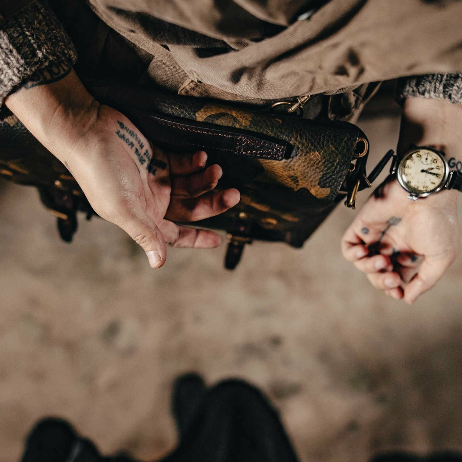 背帶設計著重自由調整與配戴彈性:可依偏好選擇肩背或斜背。5 公分寬、內襯氈呢的肩墊能有效分散重量,即使長時間背負亦維持高舒適度。