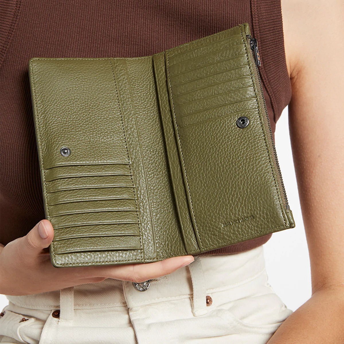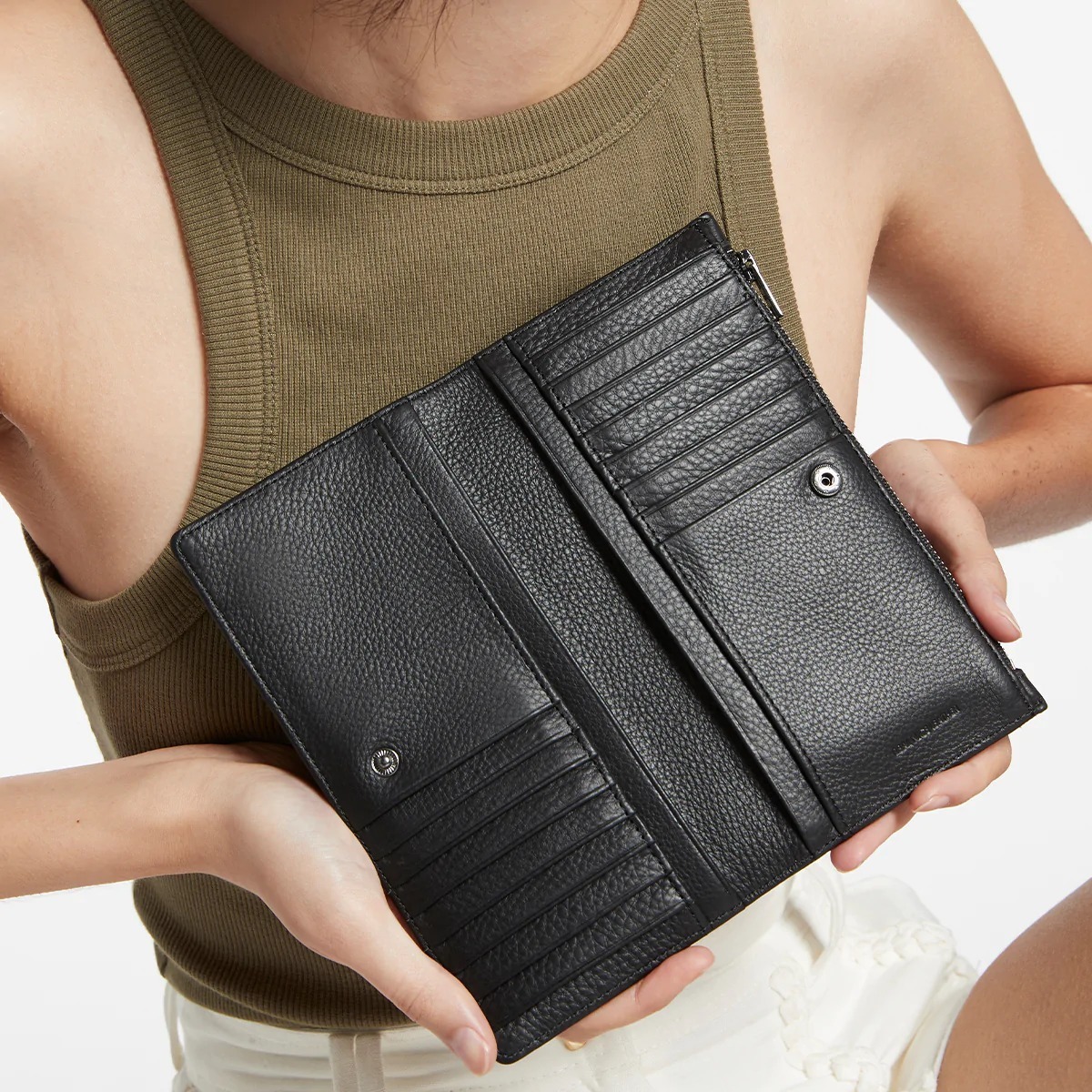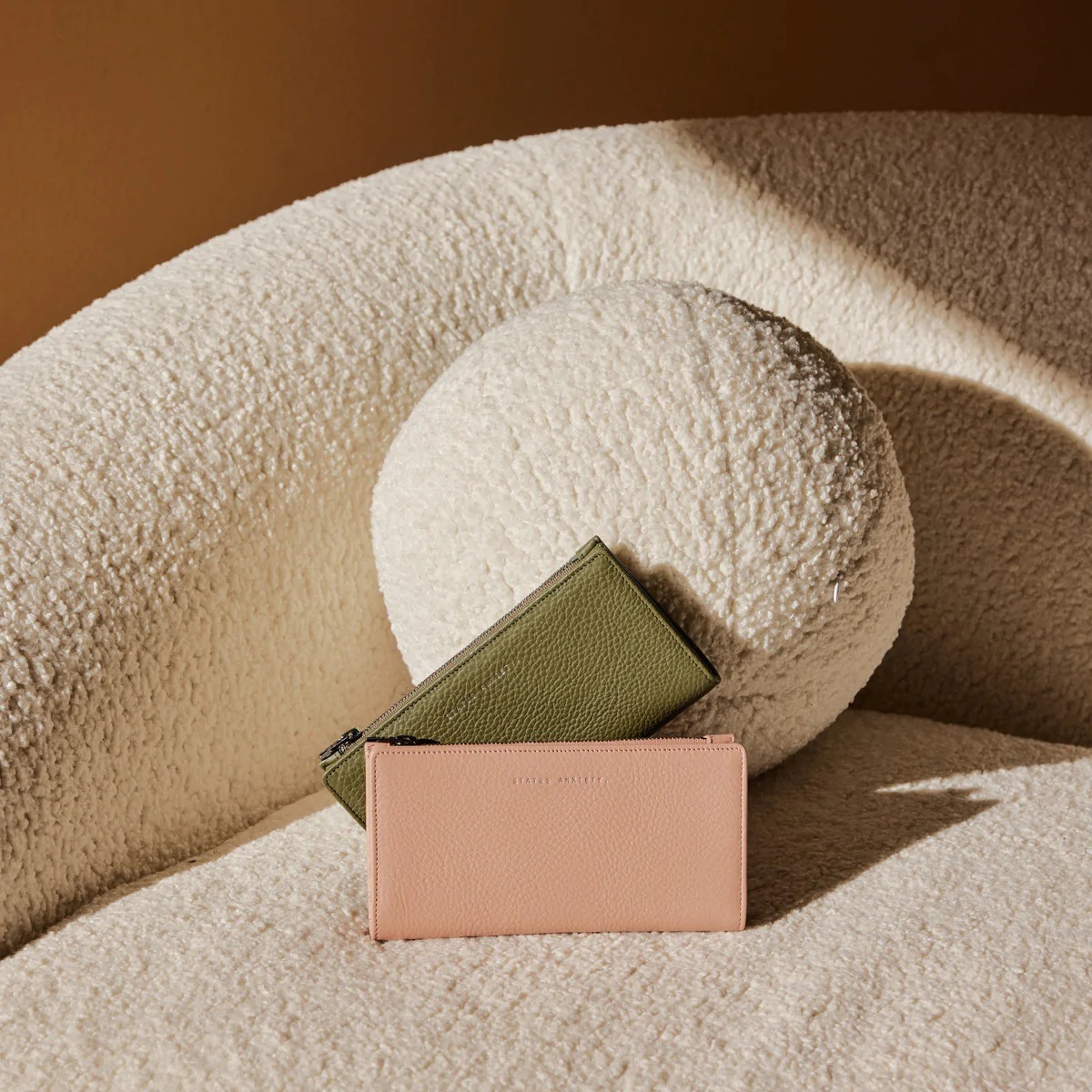 熱賣款長夾第二代!由柔軟的收縮鵝卵石皮革製成,並配有定制的 Status Anxiety. 青銅硬件。外部拉鍊部分可讓您輕鬆取用現金,無需打開錢包主體,備用卡槽確保錢包即使裝滿也能保有彈性。
