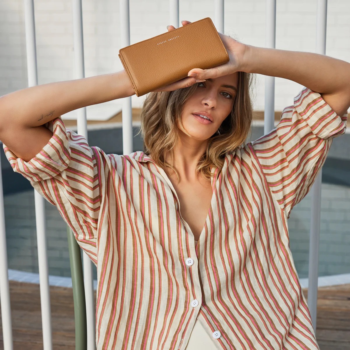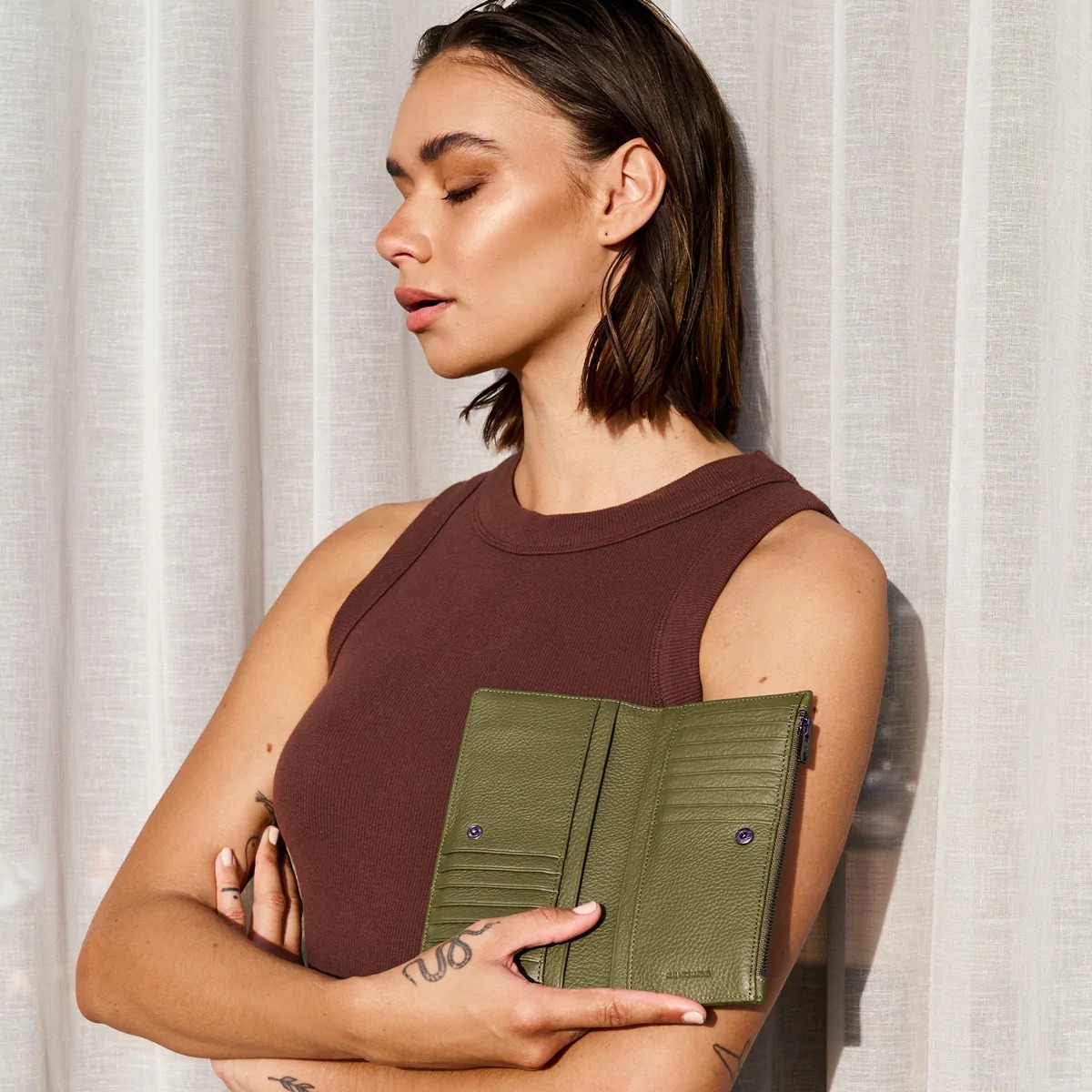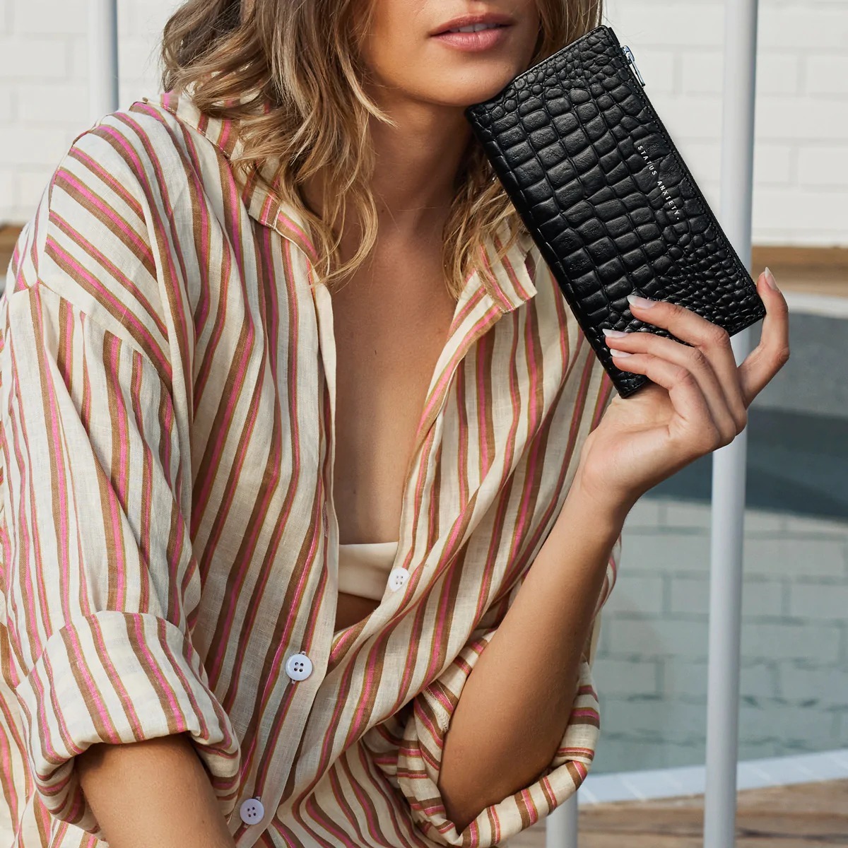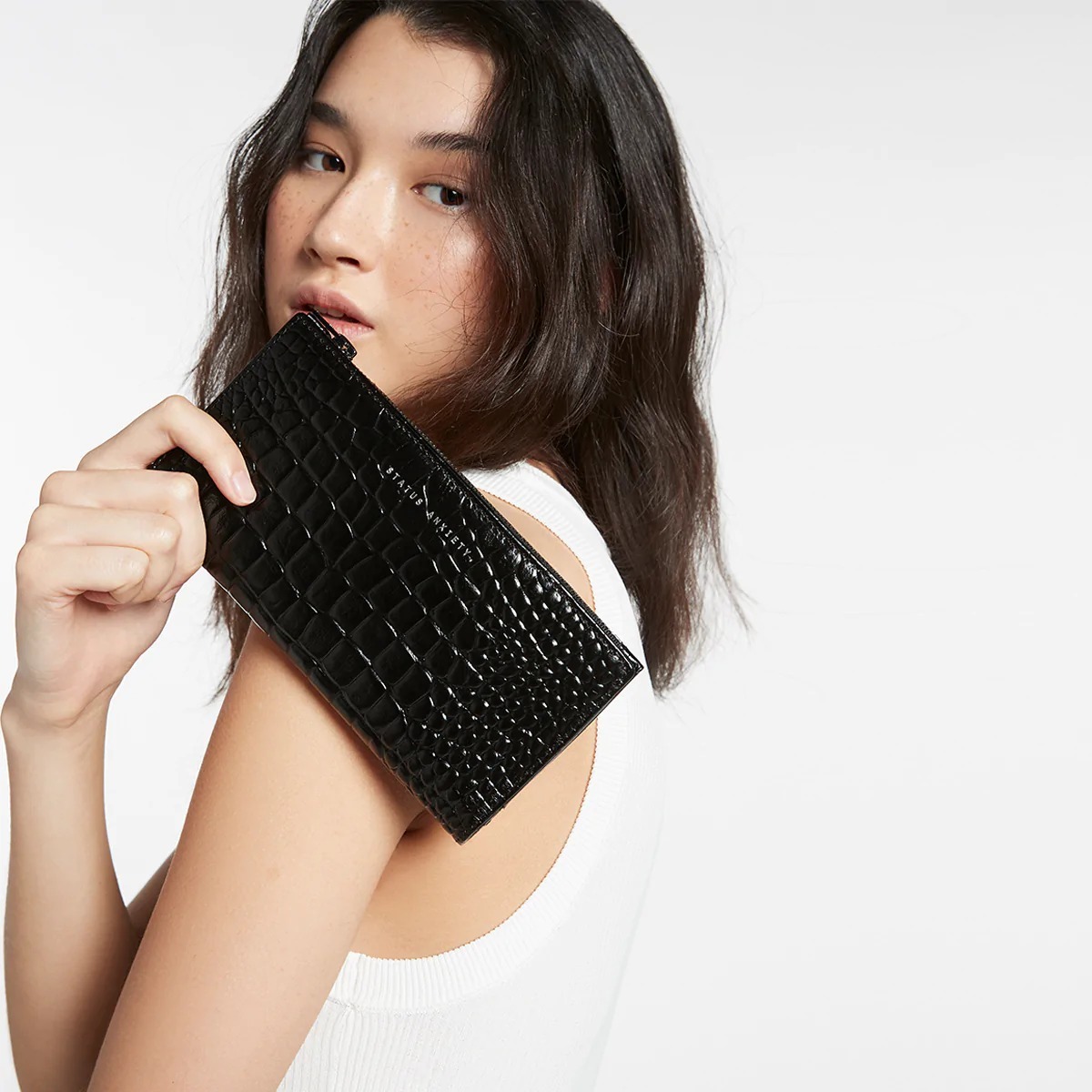 熱賣款長夾第二代!由柔軟的收縮鵝卵石皮革製成,並配有定制的 Status Anxiety. 青銅硬件。外部拉鍊部分可讓您輕鬆取用現金,無需打開錢包主體,備用卡槽確保錢包即使裝滿也能保有彈性。