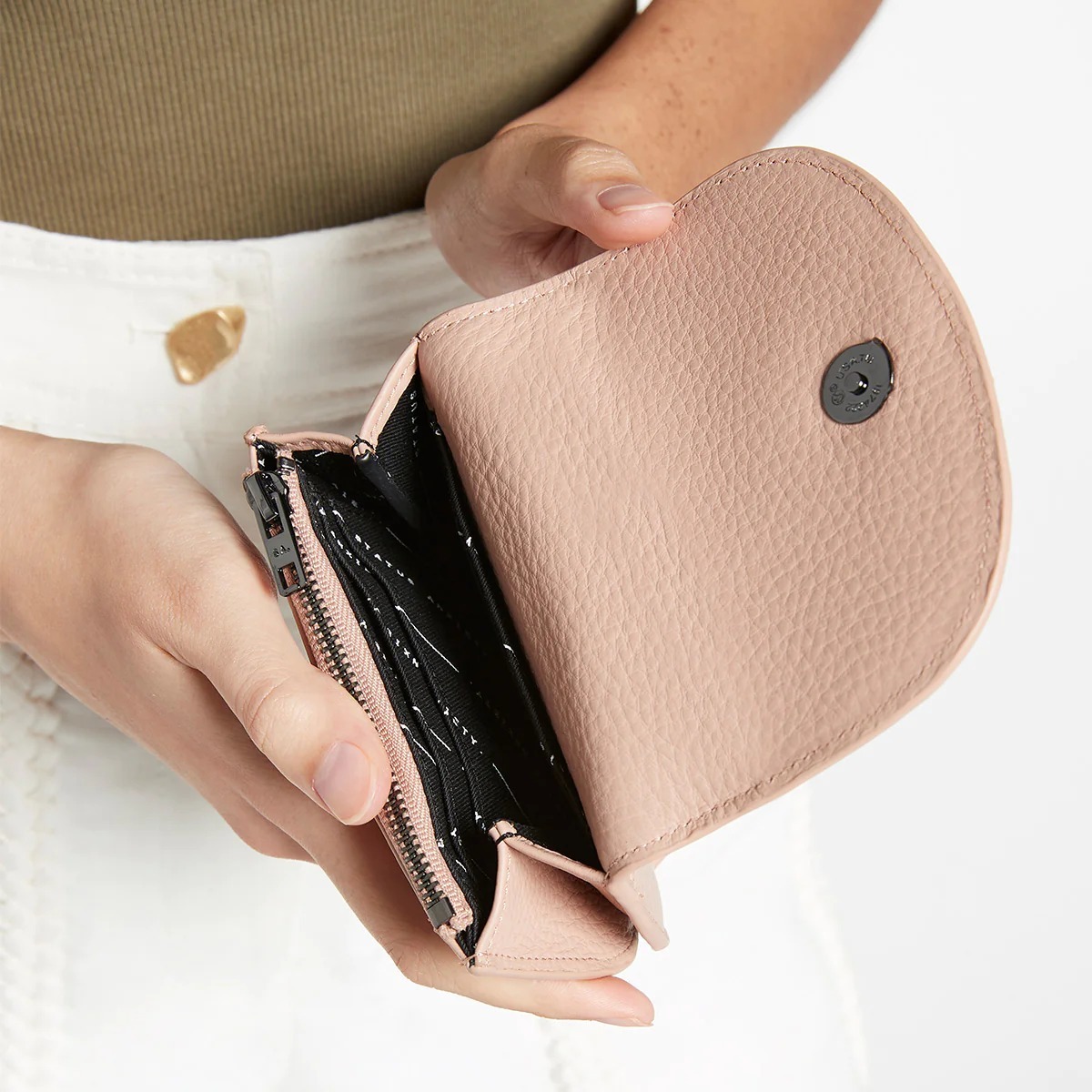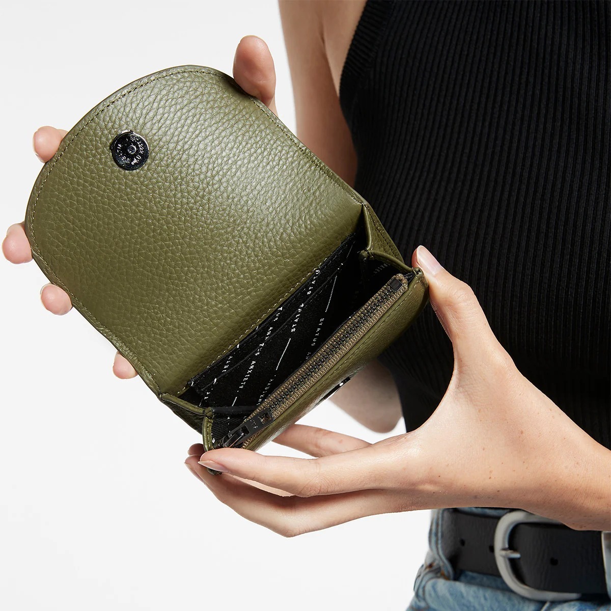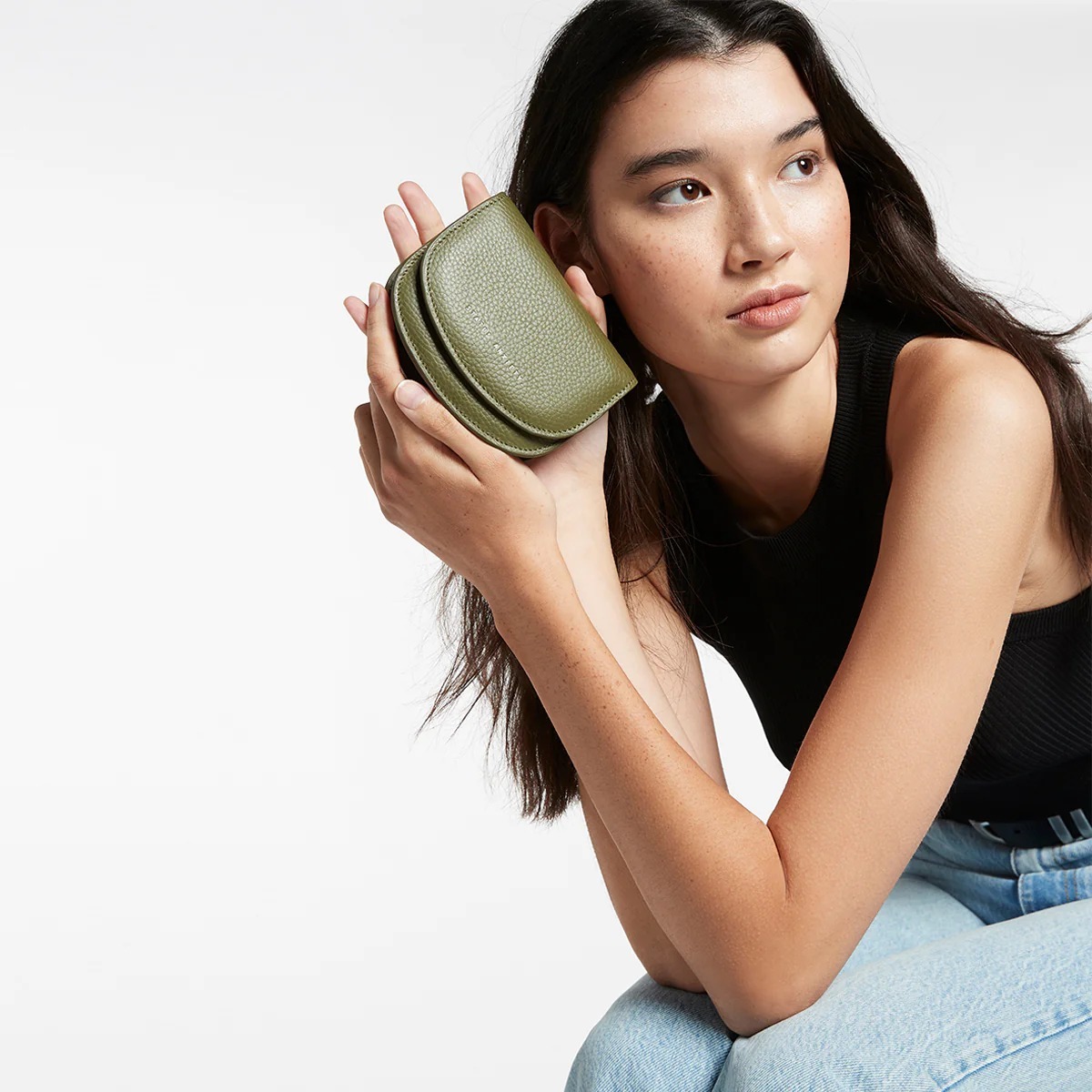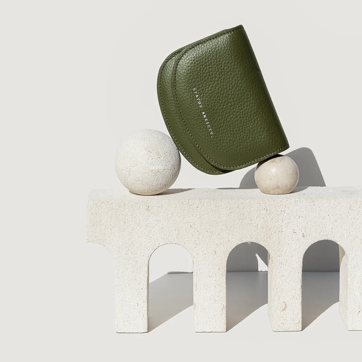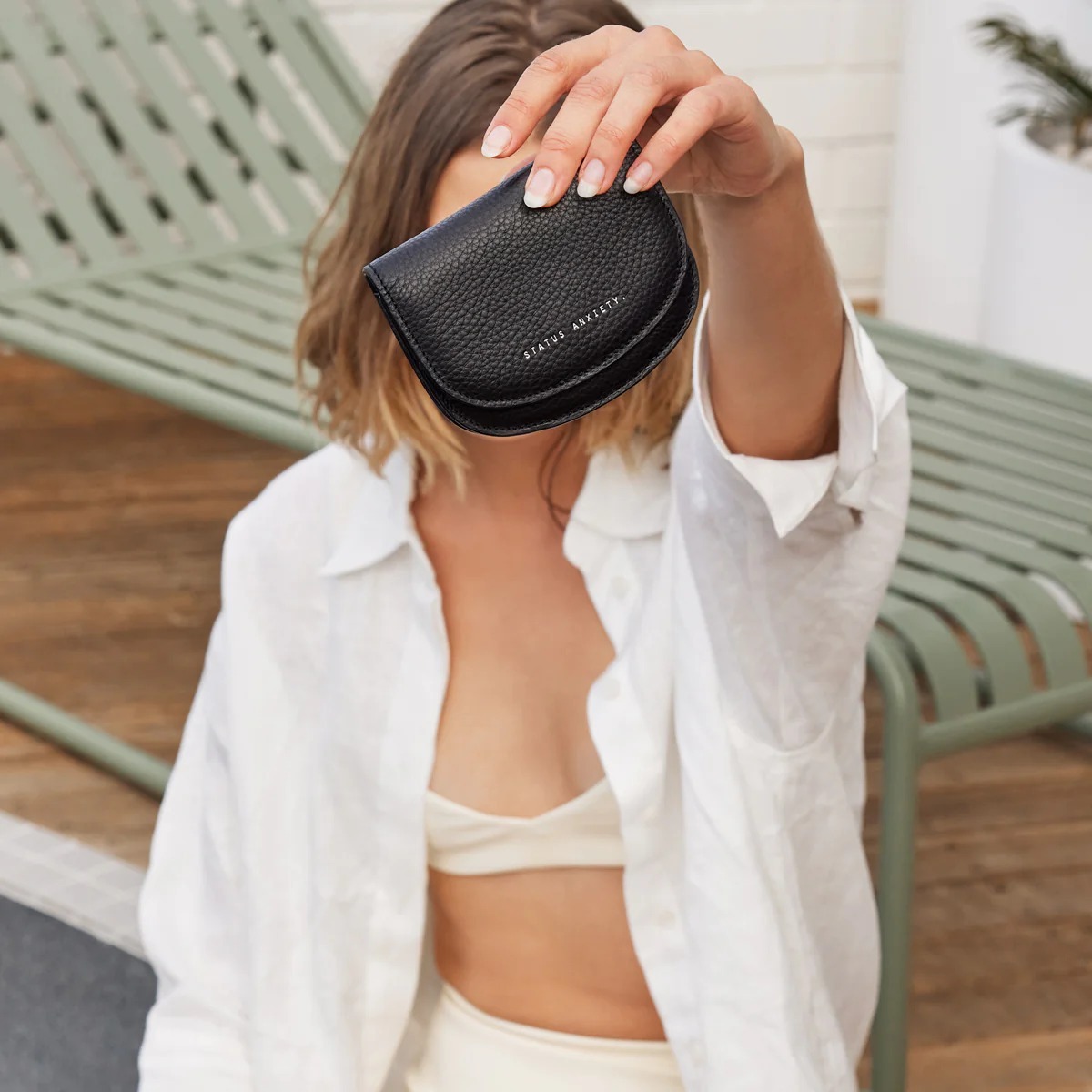 巴掌大小 x 微笑曲線外型,整體由柔軟的真皮製成,磁扣開合好拿取,細節的設計上使用Status Anxiety. 獨家的青銅五金及黑色LOGO內裡布。