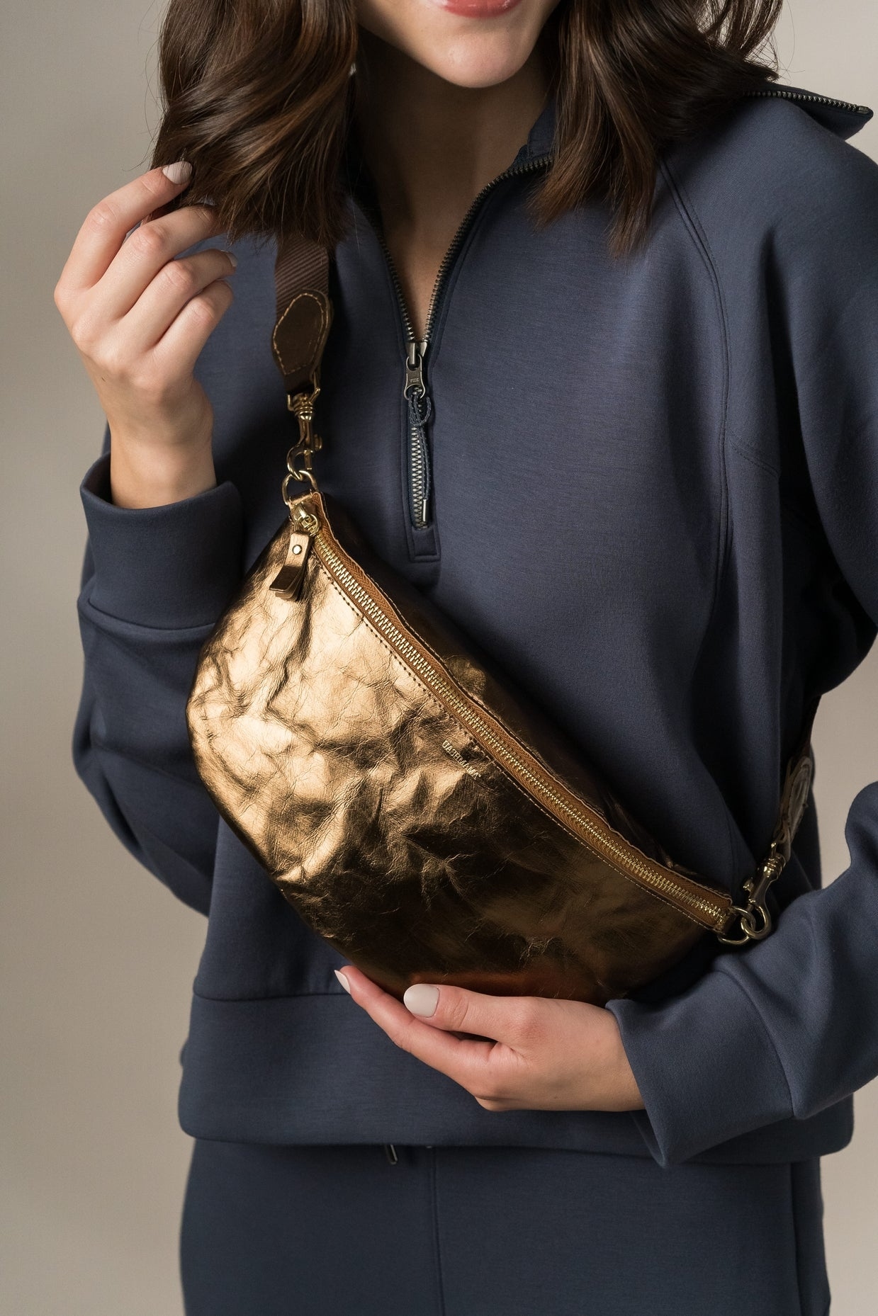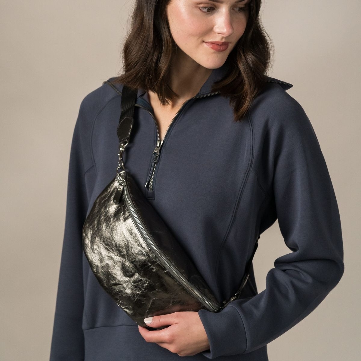 這款 Sling Body Bag 採用義大利 AGGO® 可水洗紙材製成,不僅展現自然質感,也兼顧環保理念。輕巧實用的設計,內附可拆卸且可更換的斜背帶,可依造型自由調整背法。內層附有收納口袋與拉鍊開口,確保日常小物整齊收納、隨身安心。