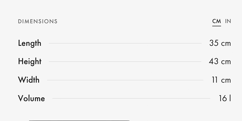 設有四對 D 形環,可依據包內容量的使用情況靈活調整不同的關閉方式。正面配有三個外部收納口袋;內部配置一個加墊的筆電隔層(可容納 16 吋筆記型電腦),對側則設有一個拉鍊小口袋。肩帶長度可透過實心黃銅扣具進行調整。