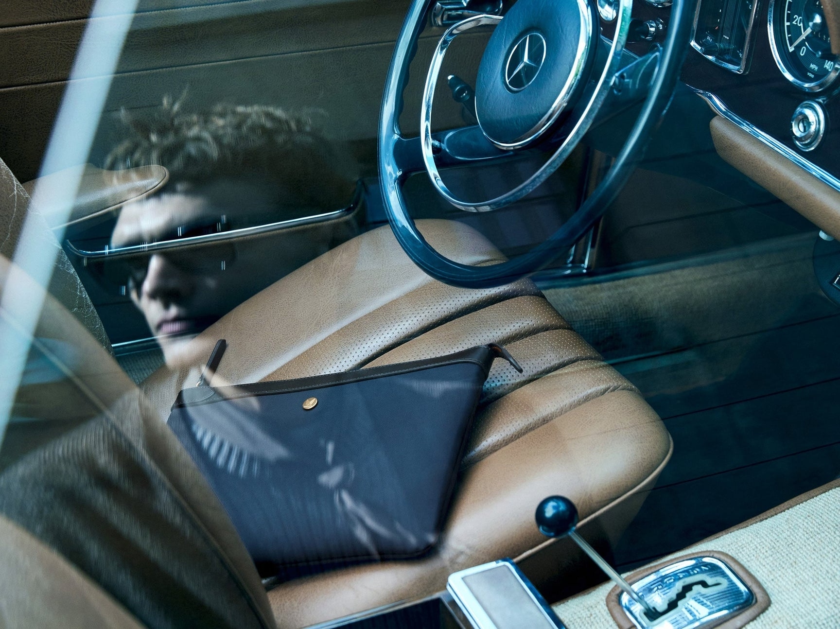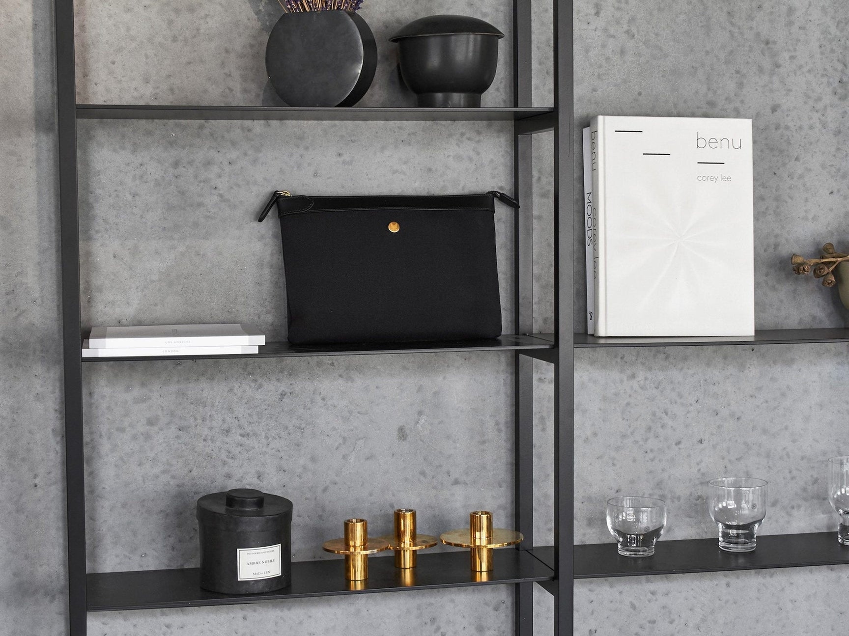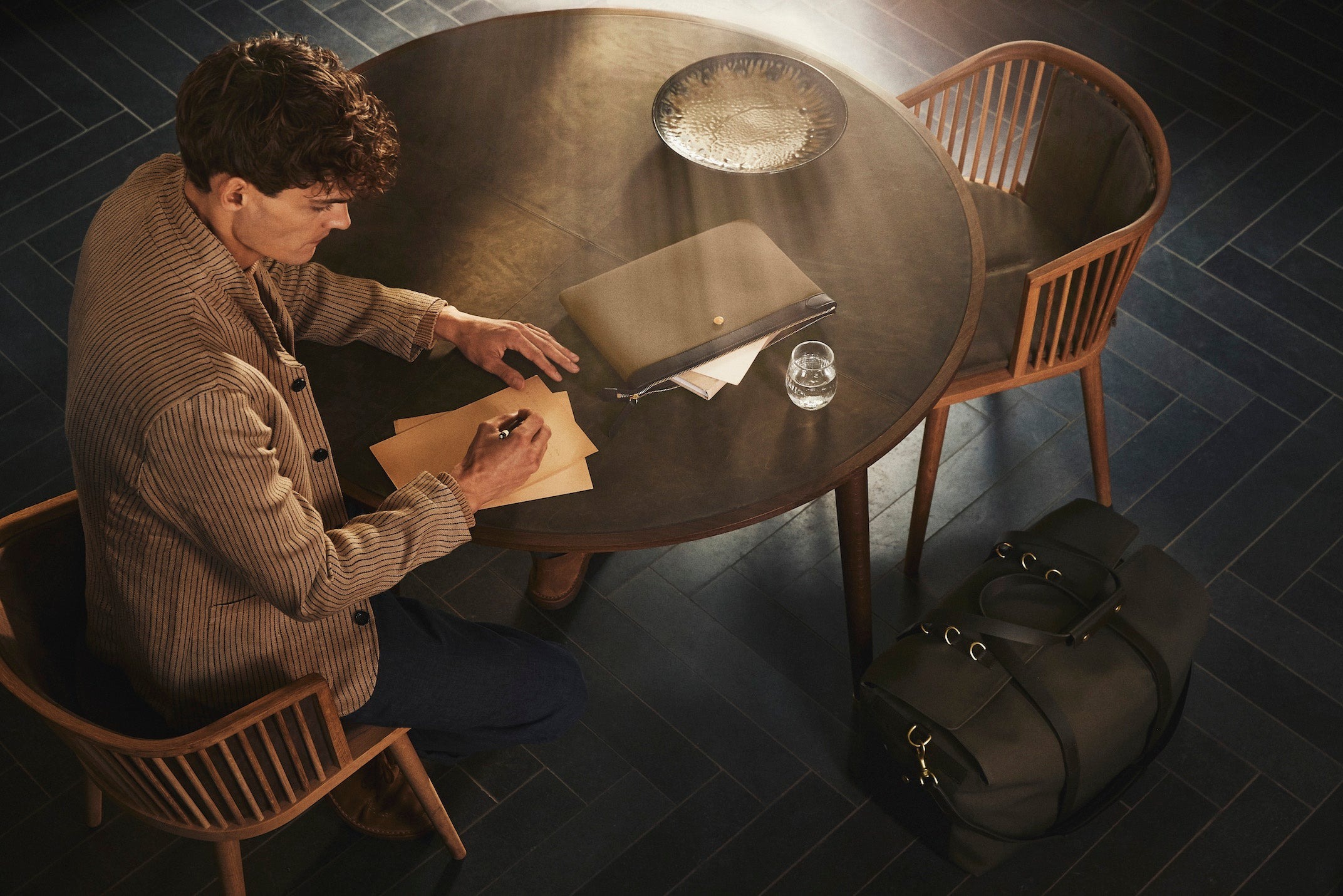 M/S Pouch Large 可輕鬆容納 14 吋筆電、A4 文件或雜誌。整體夾層內含泡棉墊層,手感柔軟,亦能有效保護貴重物品。內部設有三個開放式口袋,其中兩個位於前側,後側的第三個口袋則可輕鬆收納平板電腦。帆布的質感配上全粒面質鞣馬韁皮革,營造粗曠不羈的氣概。