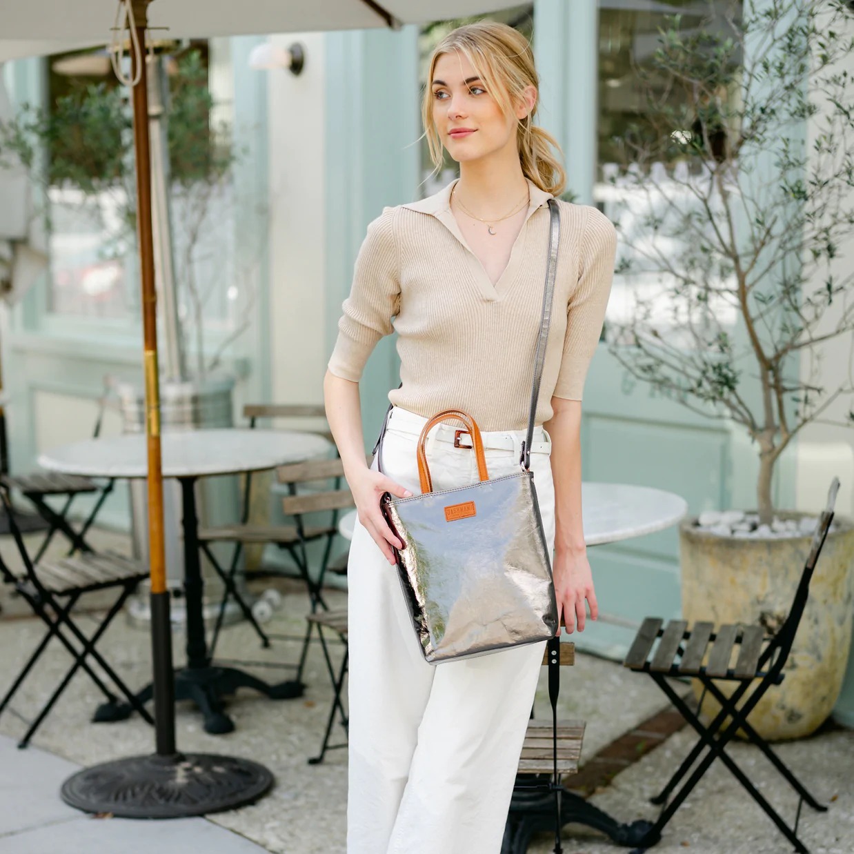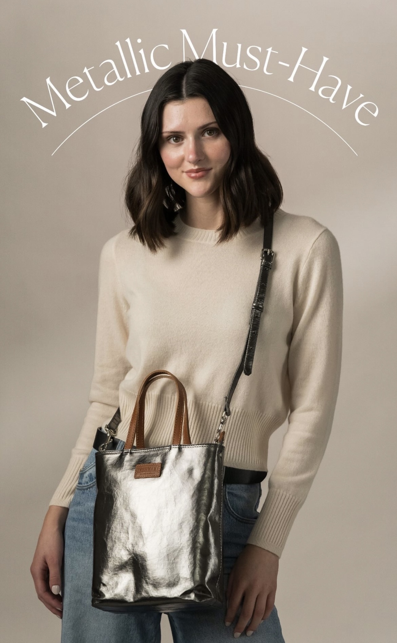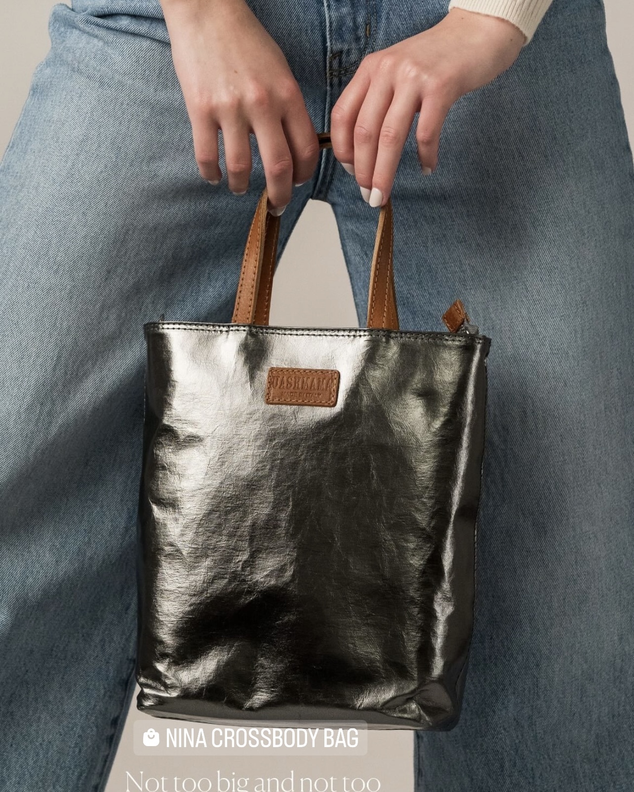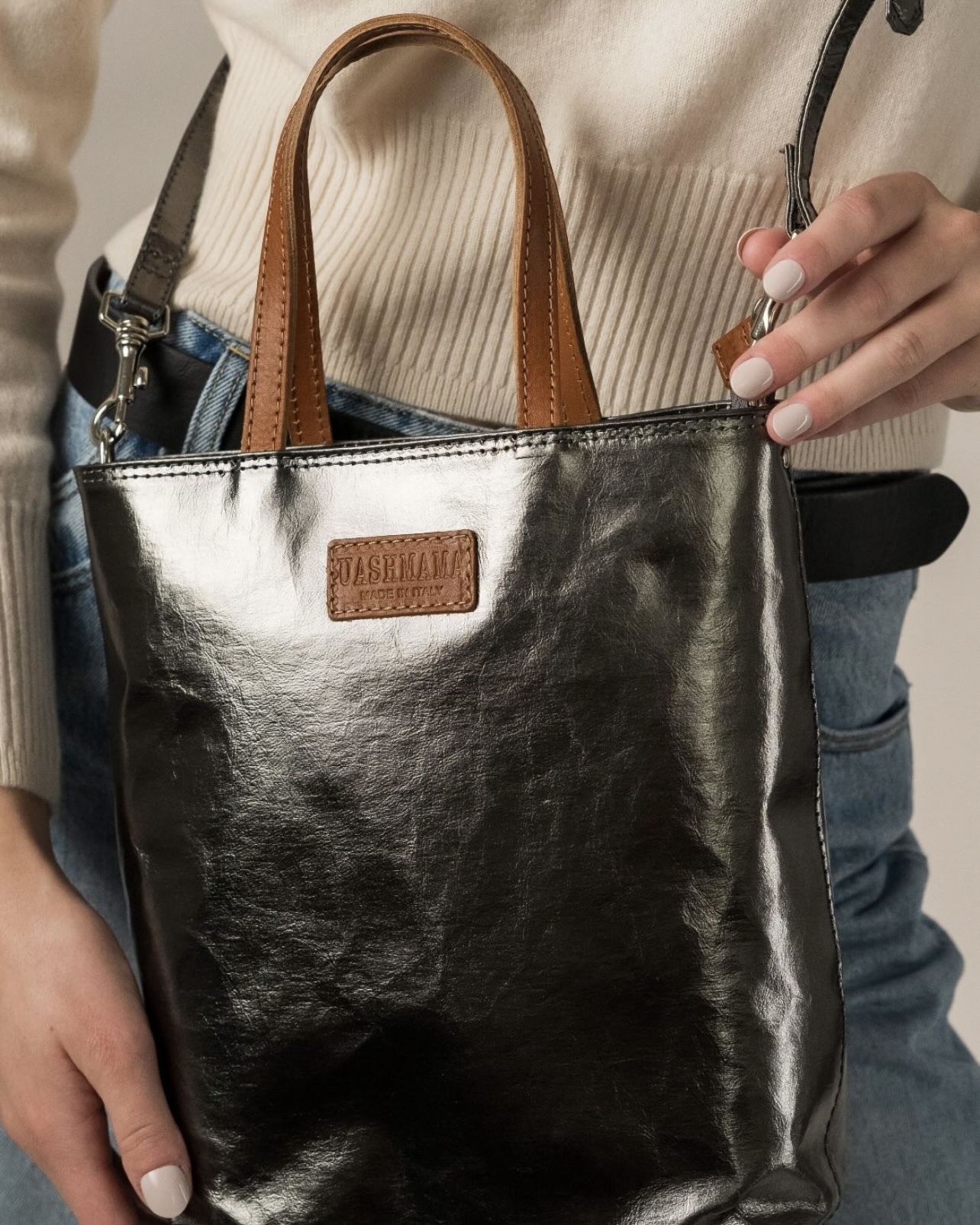 由義大利UASHMAMA專利的環保紙AGGO製成,內裡有一個拉鍊隔層是有機纖維棉製成、把手細節由植鞣皮革製成。