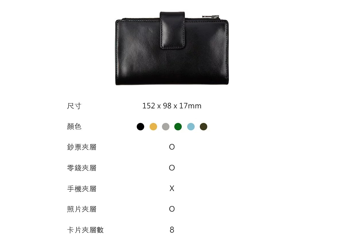 折式扣件搭配較為短版的設計,如一本公事用筆記本大小,即便今天出門拿的是小手提袋,也放得下!是一款適合追求輕便,以及旅行時攜帶的錢包。