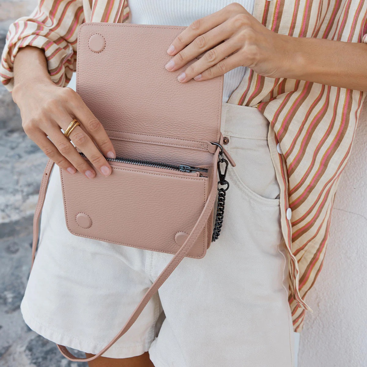 She Burns 配有雙肩帶,可從日常斜挎包轉換為更時尚的單肩包,也可以無肩帶作為手拿包。在內部,有一個獨立的拉鍊區、卡槽和寬敞的主隔層,可將您的所有必需品放入其中。