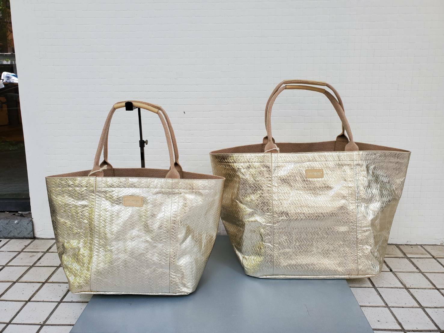 包袋使用可水洗之專利紙材,考量多數款式皆有搭配複合材料(例如:皮革手把、皮革標牌、金屬扣件、棉質內裡等),建議使用溫和清潔劑、清水擦拭,或將重點髒污部位以溫水搭配肥皂手洗方式清潔,但全程須避開皮革及金屬處。